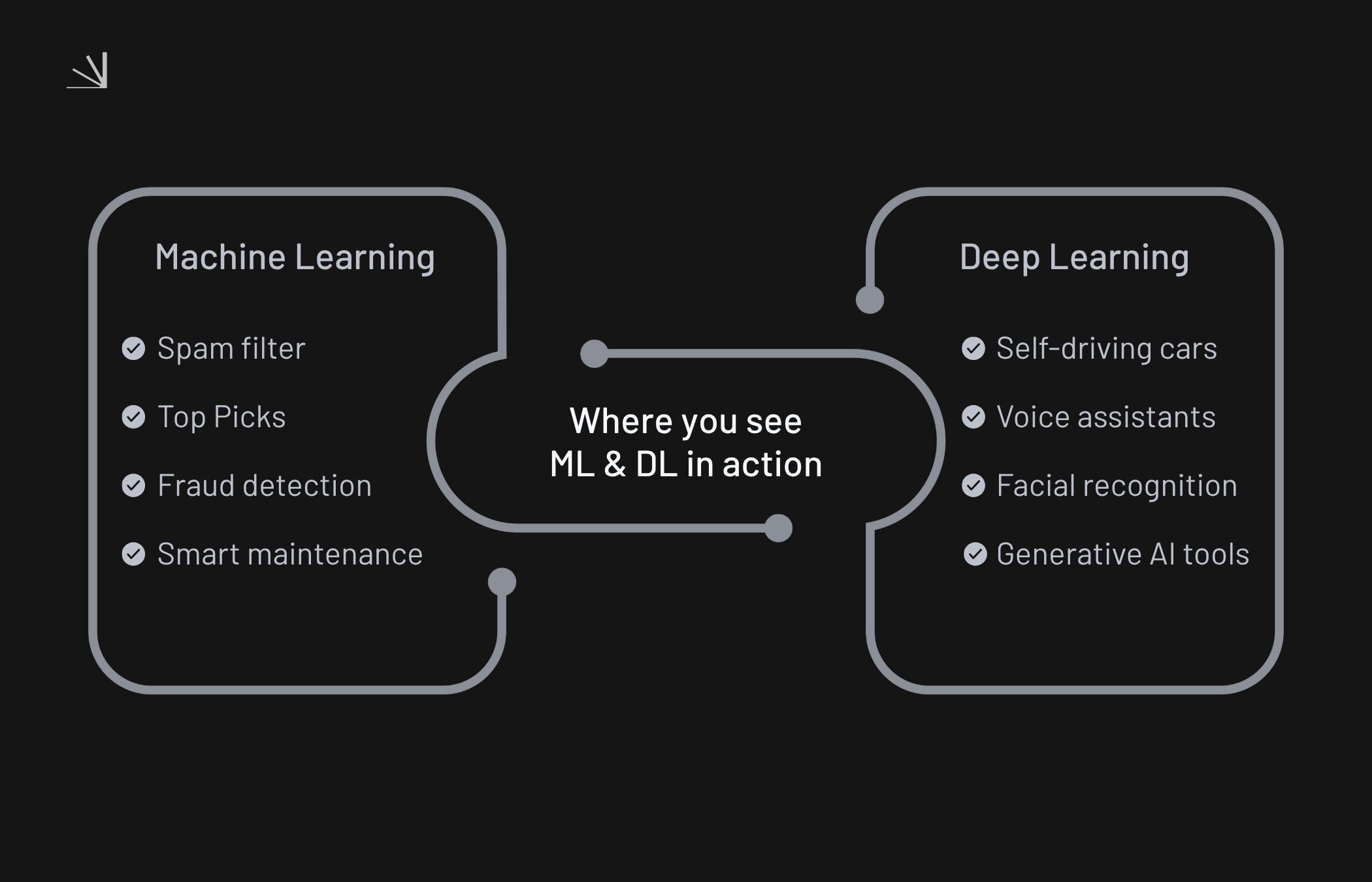 After having discussed the key differences, it becomes clearer why each is used in different applications. Their strengths, from data requirements to accuracy and complexity, explain where ML is the practical choice and where DL unlocks possibilities that simpler models can’t handle.